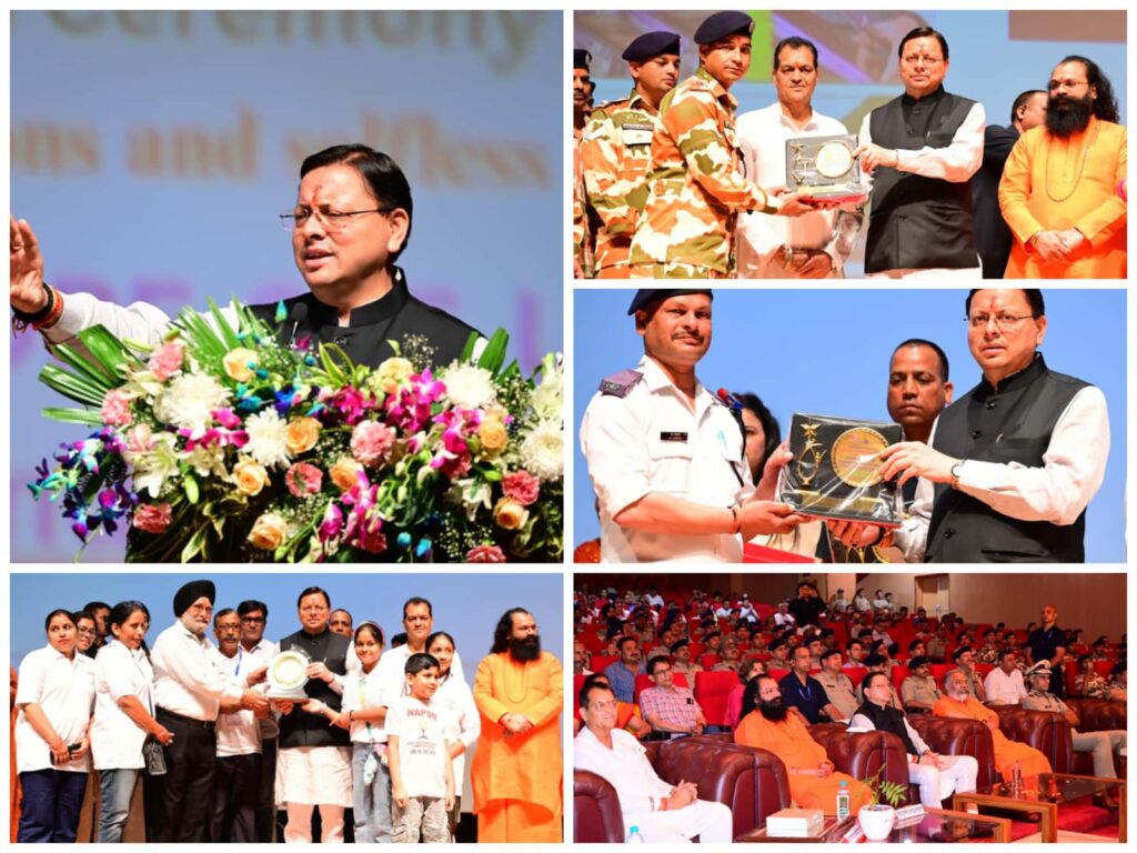 देहरादून : मुख्यमंत्री पुष्कर सिंह धामी ने शनिवार को पटेलनगर स्थित राजकीय दून मेडिकल कॉलेज में अर्पित फाउंडेशन द्वारा आयोजित ’’प्राइड मूवमेंट सम्मान समारोह’’ में आपदा के दौरान राहत एवं बचाव अभियान में योगदान देने पर एनडीआरएफ, एसडीआरएफ, पुलिस, आईटीबीपी के कर्मियों को सम्मानित किया गया।